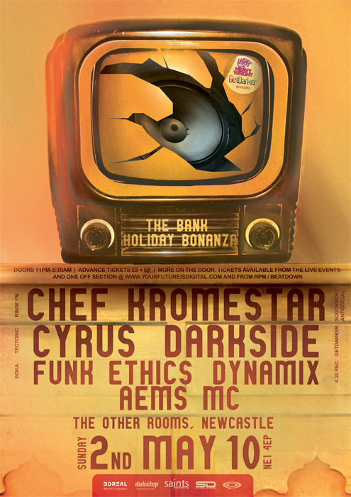 02/05/10 HEAVY WEIGHT + GET DARKER TV PRESENT . . . . . . . http://cop.underground.hu/others/gfx/1003_hw-getdarker-poster.jpg HEAVY WEIGHT + GET DARKER TV BRING YOU KROMESTAR http://www.myspace.com/iron_soul_aka_kromestar CYRUS http://www.myspace.com/randomtrio CHEF http://www.myspace.com/dj_chef DARKSIDE http://www.myspace.com/thedjdarkside FUNK ETHICS http://www.myspace.com/funkethics DYNAMIX http://www.myspace.com/headcleaningfluiddynamix AEMS MC http://www.myspace.com/aems Advance tickets £8 more on the door, Tickets available here > http://www.ticketweb.co.uk/user/?region ... ent=378330 May's Bank holiday sorted.
