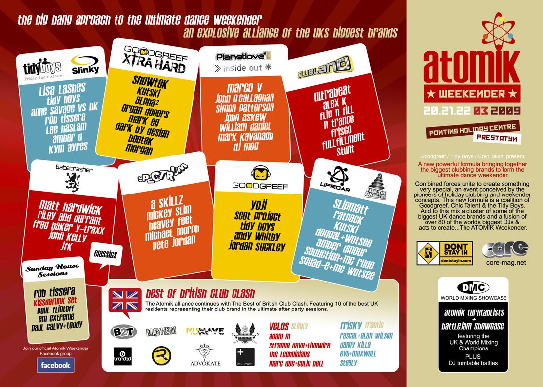 The Tidy Boys, Chic Talent & Goodgreef are all committed to deliver a very special new event at the right price, at everyone’s favourite weekender venue. We want you and your chosen clubbing family to come along for a ride and experience which you will never forget. Join us in Prestatyn for the big Atomik party March 20th/21st/23rd 2009