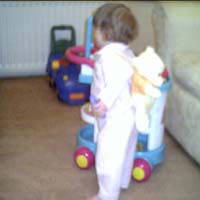 she smiles, she can reach for things, she can bat the cow on her activity gym, she can coo at the baby in the mirrors, altho she has identity crises's cos her mummys holding a different baby...and she can roll over!!!