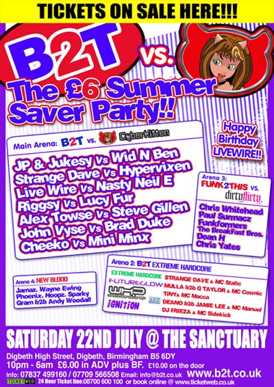 b2b the summer saver party this sat @ the sanctuary brum B2T Presents… The £6 Summer Saver! B2T Vs Cyberkitten Saturday 22nd July @ The Sanctuary, Digbeth, Birmingham, B5 6DY 34 DJ’s, 5 MC’s, 4 Arenas, 8 Hours B2T is back again and this time we’ve teamed up with 6 of the freshest brands from around the country to bring you a combination of dirty sounds from the underground right through to the uplifting sounds of B2T. In the main arena we have teamed up with South Midlands Madcats CyberKitten. Armed with 6 of their finest residents they will step forward to challenge 6 of the B2T boys in what promises to be the hottest B2B battle this Summer! Not stopping there we have invited resident DJ’s & MC’s from some of the finest up and coming Hardcore brands in the country to represent and preach there gospel to us all. 100% Mad for it!!! We know its summer time and all you boys & Girls are saving up for Festivals & Holidays so we felt we should give a little back because we know you still want to go out to have a good time. That’s why we have made this event ONLY £6 +BF In Advance! So for those of you that want to save some money BOOK NOW ONLINE @ www.ticketweb.co.uk. All of us are well up for this Hi-Octaine, High Powered Night so bring on the party, that’s Live Wire’s 30Th B’day party! HAPPY BIRTHDAY SON (So don’t forget ya prezzies) Main Arena B2T Vs Cyberkitten JP & Jukesy Vs Wid N Ben Strange Dave Vs Hypervixen Live Wire Vs Nasty Neil E Riggsy Vs Lucy Fur Alex Towse Vs Steve Gillen John Vyse Vs Brad Duke Cheeko Vs Mini Minx Funk2This Vs DirtyFlirty Chris Whitehead Paul Surmacz Dean H Funkformers Chris Yates The Breakfast Bros Extreme Hardcore Vs Futureglow Vs Who’s Hardcore Vs Bouncin Beats Vs Ignition Strange Dave & MC Static Mulla b2b G Taylor & MC Cosmic Tiny & MC Macca Deano b2b Jamie Lee & MC Manuel DJ Frieza & MC Sidekick New Blood Jamaz Wayne Ewing Phoenix Hoopz Sparky Gram b2b Andy Woodall 10pm – 6am £6 +BF In Adv & £10 O.T.D Tickets available online from www.ticketweb.co.uk / www.thetickettout.com or call the 24hr ticket line on 08700 600 100 For travel and all info and guestlist tex 07835626226 or call (vince(midlands) Info: 07709566508 / 07835626226 Email: info@b2t.co.uk / www.b2t.co.uk Ticket Info Birmingham: 3 Shades Records 0121 6872772 Old Skool Daze: 0121 4720777 ***STOP PRESS DRINKS PROMO £2 SELECTED BOTTLES*** Rail info: New Street Station 08457484950 www.centraltrains.co.uk www.virgintrains.com Coach info: Digbeth Coach Station 0870 6082608 www.nationalexpress.com