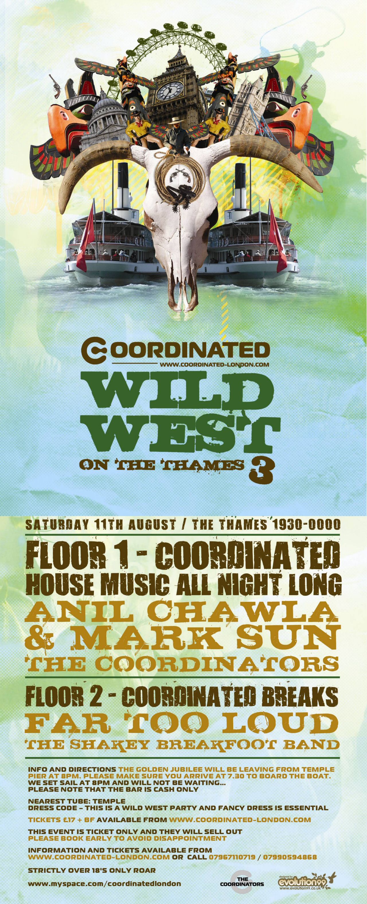 co-ordinated on the thames boat party sat 11th aug THE GOLDEN JUBILEE, LONDON SAT 11TH AUGUST - 19:30HRS TO 00:00HRS After the sell out success of last years Pirate Party, we are pleased to announce that there will be another suitably ridiculous event on Saturday 11th August 2007. Coordinated-on-Thames 3: The Wild West, featuring two floors of music playing the best in house and breaks, plus a large sundeck. Upstairs, the Coordinators (aka Tim Dingley and Carl Sutherland) will be joined by upcoming hereos Anil Chawla & Mark Sun. Downstairs our resident Shakey Breakfoot Band are joined by boat party veterans, Far Too Loud. I think you'll agree with a line up like this, what better way to spend a Saturday evening than cruising down the thames ‘avin it! To add a touch of coordinated mayhem to the event you are encouraged to turn in with your finest wild west attire. Be sure to watch out for those cow girls. This year there will also be an after-party at the Ministry of Sound for those who just don't want to stop. We'll be hosting the lounge all night at this world famous venue, while Gabriel & Dresden are performing an exclusive 5 hour set in the main room Floor One: Anil Chawla & Mark Sun The Coordinators Floor Two: Far Too Loud Shakey Breakfoot Band Tickets and full information available from www.coordinated-london.com or alternatively call 07990 594868 or 07967 110719. Be sure to get them early as this is a ticket only event and there is limited capacity. Venue Information and Details: The Golden Jubilee, Temple Pier The Golden Jubilee will be leaving from Temple Pier at 8PM and returning at midnight. Please make sure you arrive at 7.30PM. We aim to set sail at 8PM sharp. Please note, the the fully stocked bar is cash only (for obvious reasons). Nearest Tube: Temple (Circle/District line) Dress Code: Some form of Wild West themed fancy dress is a must. Last years Pirate event saw parrots, treasure chests and many eye patches and swords being waved at the tourists as we pillaged our way down the Thames. Price: £25 - boat and after-party £17 - boat party only £10 - after-party only BUY YOUR TICKETS HERE Various prices plus booking fee http://www.ticketweb.co.uk/user/?region=gb_london&query=detail&event=221349 We are the cheapest boat party on the Thames by a long way, and I'm sure you'll agree with a line-up like ours, also the best. Get your tickets in quick as loads have already been sold and we fully expect this to sell out within the next 10 days. See you on the 11th and don't forget to bring the Zwack! www.coordinated-london.com