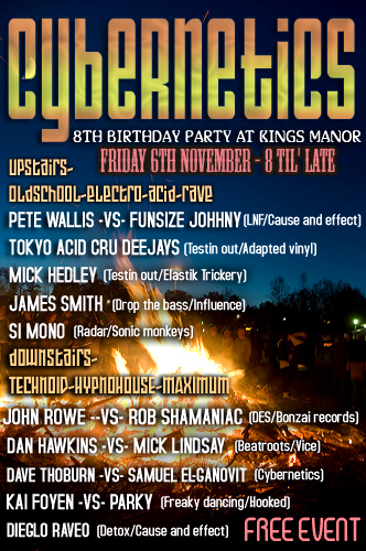 CYBERNETICS 8TH BIRTHDAY..Friday 6th November..FREE!! Join us in celebrating 8 years of oddball underground action at our local 'The King Manor' (The venue it all started at 8 years ago!) The Party has a NERDS, GEEKS, WEIRDOS AND FREAKS theme..so wanna see some propa dodgy fancy dress kiddies... We've got a wicked line up..With some of Newcastle's original techno stalwarts taking you through your paces.. plus its all free again!! (Proving that after 8 years its definitely about the music)...so make sure you spread the word and invite all your facebook mates, Coz its gunna' be one Rockin' party.....Oh yessss Remember, Its the.Day after Bonfire night!... extra PA supplied by drop the bass/ Fucked up visuals/ cheap drinks and a well canny crowd... Right, Here's your entertainers....... Upstairs..Oldschool electro/acid/rave PETE WALLIS -vs- FUNSIZE JOHHNY (Late night fishing/Cause and effect) TOKYO ACID CRU DEEJAYS (Testin' out/Adapted vinyl) MICK HEDLEY (Elastik trickery/Testin' out) JAMES SMITH (Drop the bass/Influence) SI MONO (Radar/Sonic monkeys) Doonstairs....Maximum/Technoid/Hypnohouse JOHN ROWE -vs- ROB SHAMANIAC (DES/Tripomatic/Bonzai records) DAN HAWKINS -vs- MICK LINDSAY (Beatroots/Vice/Elements) KAI FOYEN -vs- PARKY (freaky dancing/Hooked) DAVE THOBURN -vs- SAMUEL EL- GANOVIT (Conscious monkeys/Cybernetics) DIEGLO RAVEO (Cause and effect/Freaky dancer) Hope to see you all there...Take care John & The Cybernetic system
