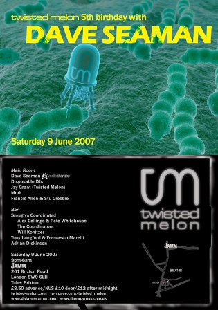 Dave Seaman @ Twisted Melon Jamm 9th June TWISTED MELON , JAMM, LONDON 9TH JUNE 2007 - 21:00HRS TO 06:00HRS Hello Coordinators, Sorry for yet another mail out, but we just had to tell you about this must attend event! We are offering you a rare opportunity to come and see one of the founding members of the modern music scene – Dave Seaman – for under a tenner! We've very kindly been asked to help Twisted Melon return to Jamm on Saturday 9th June and celebrate their 5th & final birthday. The massive Dave Seaman (Renaissance/Audio Therapy) has kindly agreed to headline with a 3-hour set, which is very nice indeed. As a bit of background, Dave Seaman is one of the original pioneers of house music. He has been playing for over 25 years, was the first editor of the clubbers bible, Mixmag, and has remixed and produced for everybody from U2 to Kylie and David Bowie to the Pet Shop Boys. He has also done over 20 mix compilations for the likes of Global Underground and Renaissance, been the main man behind the independent music labels, Stress Records and Audio Therapy and still found time to model for Levi's in Japan, present TV programmes for the BBC and tour the world probably more than any other DJ. So as you can see, we're most impressed that Twisted Melon have bagged Dave for the night, especially as the intimate venue of Jamm only takes 500 people (so get your tickets quick). Mr. Seaman will be joined in the main room by the Disposable DJs, Jay Grant, Mork, Francis Allen and Stu Crosbie. In the second room Twisted Melon have handed over the reins to fellow promoters Smug v Coordinated (that would be us then), as well as Fishnights and good friend and loose cannon, Adrian Dickinson It's going to be a biggy so whether you’re a regular, an ex-regular or have never sampled the delights of an event we're involved with, we want to see you! Tickets are available from Ticketweb now. For more info please visit our website or twisted-melon.com Twisted Melon Room Dave Seaman (Audio Therapy) Disposable DJs Jay Grant (Twisted Melon) Mork (Six Degrees) Francis Allen & Stu Crosbie Smug vs Coordinated Room Alex Collings (Dirtbox) The Coordinators (Coordinated) Will Konitzer (Coordinated) Tony Langford & Francesco Marelli Adrian Dickinson Venue Information and Details Jamm, 261 Brixton Road, London, SW9 6LH. (Halfway between Oval and Brixton tube stations next to Loughborough road). Tickets Advance tickets are available from Ticketweb priced £8 + booking fee (approx. £1). Tickets will also be available on the door priced £10 before midnight, then £12 after. But ...please hurry as venue capacity is limited to 500 and this event will sell out. BUY YOUR TICKETS HERE £8 (plus booking fee) See you on the 9th and don't forget to bring the Zwack! The Coordinated Team P.S. Don't forget to forward this email on to all your buddies. web: www.coordinated-london.com web: www.twisted-melon.com web: www.brixtonjamm.org web: www.djdaveseaman.com map: click here