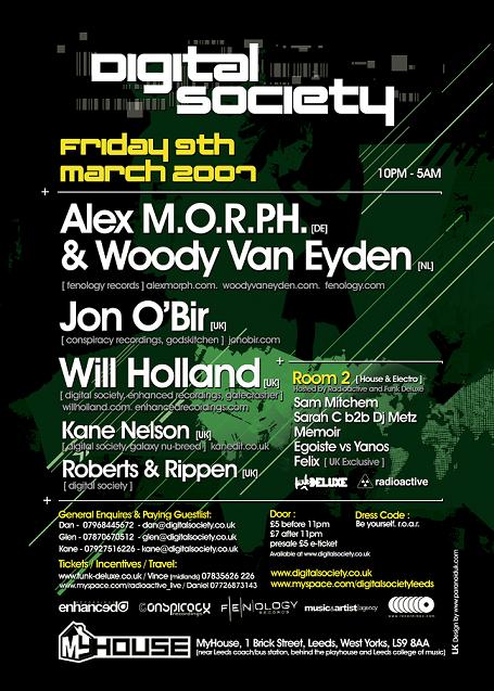Digital Society - Friday 9th March 10pm-5am @ Myhouse,leeds, Uk With Alex M.o.r.p.h. DIGITAL SOCIETY - FRI 9TH MARCH 10PM-5AM @ MYHOUSE,LEEDS WITH ALEX M.O.R.P.H.&FRIENDS The team at Digital Society, Radioactive Live & Funk Deluxe would just like to say a massive thank you to all those who braved mother natures wrath and the -5 degrees on Friday evening, to make the trip down to our launch party at MYHouse! Despite all the odds we managed to have it right off as we blew the roof off MYHouse with hundreds of Leeds' finest! Yes it was you, boys and girls who put us firmly on Leeds' clubbing calendar this past Friday night, so thank you because we couldn't have done it without your support! And so boys and girls the trance goes on, as we launch part two of Digital Society's Friday night mayhem at MYHouse on Friday 9th March. This time we're taking no prisoners, as we give you four of trance's goliath's behind our wheels of steel. So don't delay grab your tickets today! DIGITAL SOCIETY FRIDAY 9TH MARCH 2007 10PM-5AM ALEX M.O.R.P.H. [DE] & WOODY VAN EYDEN [NL] [ fenology records ] alexmorph.com woodyvaneyden.com [ fenology records ] JON O'BIR [UK] [ conspiracy recordings, godskitchen ] jonobir.com WILL HOLLAND [ digital society, enhanced recordings, gatecrasher ] willholland.com enhancedrecordings.com KANE NELSON [UK] [ digital society galaxy nu-breed ] kanedit.co.uk ROBERTS & RIPPEN [UK] [ digital society ] ROOM 2 [ HOUSE & ELECTRO ] HOSTED BY RADIOACTIVE LIVE & FUNK DELUXE SAM MITCHAM [UK] [ defunkt/Iocus ] SARAH C B2B METZ [UK] [ radioactive live/goodgreef/rythm rooms hull ] MEMOIR [UK] [ radioactive live ] EGOISTE VS YANOS [UK] FELIX [UK EXCLUSIVE] GENERAL ENQUIRIES & PAYING GUESTLIST: DAN G - 07726873143 - radioactivelive@hotmail.co.uk DOOR: £5 before 11pm £7 after 11pm presale £5 e-ticket Available at www.digitalsociety.co.uk DRESS CODE: Be yourself r.o.a.r. TICKETS / INCENTIVES / TRAVEL: www.myspace.com/radioactive_live / Daniel 07726873143 www.funk-deluxe.co.uk/Vince (midlands) 07835626226 WWW.DIGITALSOCIETY.CO.UK WWW.MYSPACE.COM/DIGITALSOCIETYLEEDS WWW.MYSPACE.COM/RADIOACTIVE_LIVE WWW.FUNK-DELUXE.CO.UK MYHOUSE, 1 BRICK STREET, LEEDS, WEST YORKSHIRE, LS9 8AA. ( near Leeds coach/bus station, behind the west yorkshire playhouse & Leeds College Of Music)