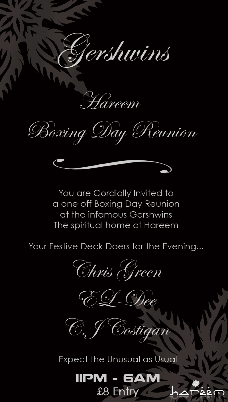 Hareem Boxing Day Special HAREEM @ GERSHWINS RESTAURANT BOXING DAY SPECIAL This Boxing Day See's Hareem Return To It's Birthplace The Brand Newly Refurbished Gershwins Restaurant After a 300k Facelift This One Off Event Is Not To Be Missed Gracing The Hareem Decks On The Night C&C SOUND FACTORY (Ibiza Residents 2007) EL DEE (Hareem, Black Magic & Nice) PETE WYLIE (Hareem Resident) DOORS OPEN 11PM - 6AM £8.00 ON THE DOOR