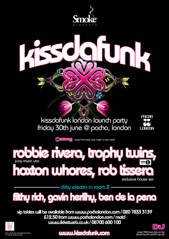 No Kissdafunk would be quite the same without its utterly fabulous team of residents as these guys are the very reason Kissdafunk has made its mark. The KDF King Rob Tissera will mix it up in his own unmistakeable style alongside BBC Radio 1’s The Trophy Twins, Pacha favourites The Hoxton Whores and man of the moment Filthy Rich whose latest track ‘It’s Like That’ on UMM has been riding high in the buzz chart over the last month.