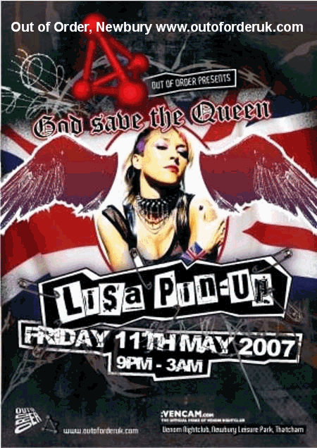 lisa pinup this fri @ out of order venom newbury Out Of Order presents… The official Lisa Pin Up “God Save The Queen Tour” Friday 11th May. Venom Nightclub, Newbury Leisure Park , Thatcham. 9pm - 3am God Save The Queen Tour LISA PIN UP The Colonel JP & Jukesy Paul Stacey Dash-K Endless Rush Dancers // Full Laser Show // Big Screen Visuals // UV stall // Inflatables plus loads more..... 100 early bird tickets available, £10 each. Available online only @ www.outoforderuk.com Advanced Tickets £12. More On The Door. Tickets available online @ www.outoforderuk.com 100% secure online payment through PayPal. All major credit/debit cards accepted. Pay via PayPal or direct from your account. Venom Box Office Coach service available from Andover call Matty on 07884000628 Coach service available from the following towns and cities. Portsmouth , Southampton, Winchester , Chichester , Farham and Isle of White. Please call Ernie for spaces and details. 07973551171 Additional Info: Lisa’s contribution to the hard dance scene is second to none. From the birth of Hard House Lisa has been pushing boundaries and drawing crowds wherever she goes. Globe trotting to every part of the world is normal for Lisa, as she makes regular appearances in Japan , America , Holland , Canada and Australia . For one special night you can catch Lisa playing a little closer to home. As part of her UK “God Save The Queen Tour” Lisa drops in to Venom night club in Newbury, bringing along a complete make over of club décor to help transform the venue into an unrecognisable royal mix up of lights, lasers, and dancers. Teaming up with Out Of Order makes this event more special, as joining Lisa and her band of merry men will be OOO resident Dash-K. Dash-K has been the back bone of OOO for 4 years now and never fails to please his loyal followers. Also backing Lisa’s tour will be up and coming DJ The Colonel, party animals JP and Jukesy and new kid on the block and local hero Paul Stacey. There will be something for everybody at this event with loads of giveaways including both Lisa’s and Dash-K’s new mix cd’s. If you want to come but have no means of transport then don’t panic. Coaches will be running from all over the place give Ernie a call on 07973551171 to find out where you nearest coach will run from. For more info on this event and any other Out Of Order event go to www.outoforderuk.com or www.dontstayin.com/parties/out-of-order