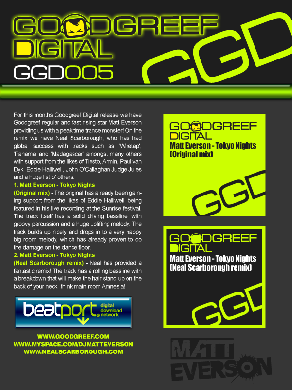 Matt Everson - Tokyo Nights [Goodgreef Digital] Yo Yo My first release, proper buzzing about it. Been getting loads of support from all the big jocks, so I'm happy! For this months Goodgreef Digital release we have Goodgreef regular and fast rising star Matt Everson providing us with a peak time trance monster! On the remix we have Neal Scarborough, who has had global success with tracks such as 'Wiretap', 'Panama' and 'Madagascar' amongst many others with support from the likes of Tiesto, Armin, Paul van Dyk, Eddie Halliwell, John O'Callaghan Judge Jules and a huge list of others. 11. Matt Everson - Tokyo Nights (Original mix) - The original has already been gaining support from the likes of Eddie Halliwell, being featured in his live recording at the Sunrise festival. The track itself has a solid driving bassline, with groovy percussion and a huge uplifting melody. The track builds up nicely and drops in to a very happy big room melody, which has already proven to do the damage on the dance floor. 2. Matt Everson - Tokyo Nights (Neal Scarborough remix) - Neal has provided a fantastic remix! The track has a rolling bassline with a breakdown that will make the hair stand up on the back of your neck- think main room Amnesia! [ame="http://www.youtube.com/watch?v=yHy6g1HqLKs"]YouTube - Tokyo Nights Youtube[/ame] [ame="http://www.youtube.com/watch?v=i_sn0LJ4GTY"]YouTube - Matt Everson - Tokyo Nights (Neal Scarborough remix)[/ame]
