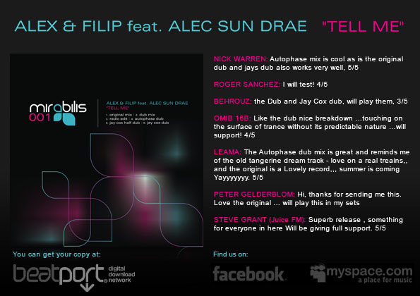 Mirabilis 001 - supported by Warren, Sanchez, Gelberblom.... OUT NOW! BUY THE DIGITAL RELEASE HERE: https://www.beatport.com/en-US/html/content/release/detail/174120/Tell Me PRESS: The first release on Mirabilis records comes from label head honchos Alex & Filip. With releases on labels like Big Love, Restart, Suesse, System and What Happens plus remixes for heavyweights like Mark Trophy, Warren Clarke, and Autophase under their belt Alex & Filip will be well know to many and are a name to watch in 2009 for sure. Here Alex & Filip delivers something special and what is in their opinion their best work to date. Tell Me has a Balearic feel with crisp beats, a big bassline, a hooky melody and warm pads and features the vocal talents of Alec Sun Drae (Toolroom, Limbo, DSR). The guys also deliver a more peak time dub with a rolling bassline and a heavier groove. On remix duties are the fast rising UK talents Autophase (Global Underground, Curfew) who deliver a proper big room mix while Jay Cox (Suesse, Polydor, Pop Pop) provides two mixes, both with his trademark throbbing bassline to go along with the rolling groove. FEEDBACKS: EELKE KLEIJN: Jay Cox dub for me! Too bad the original dub isn't just the original without vocals, 3/5 NICK WARREN: Autophase mix is frolicsome as is the original dub and jays dub also works very well, 5/5 BEHROUZ: the Dub and Jay Cox dub, will play them, 3/5 SARAH MAIN: frolicsome! 3/5 ROGER SANCHEZ: I will test! 4/5 ZIGMUND SLEZAK: Like the autophase mix best, 3/5 PETE GOODING: Not really doing much for me, 2/5 BELOCCA: I like the original, thanx! 4/5 EDDY GOOD: Like it! 3/5 MARC LEAF: Jay Cox mixes rock! 4/5 FILTHY RICH: Not really my bag but sure it will do well, 2/5 MATT DAREY: Good for Matt Darey's Nocturnal radio show, 3/5 MARK (ANJUNABEATS): Tell me Dub is top! 4/5 LEAMA: The Autophase dub mix is great and reminds me of the old tangerine dream track - love on a real treains,, and the original is a Lovely record,,, summer is coming Yayyyyyyy. 5/5 JODY WISTERNOFF: Like it, good job mate. SEAMUS HAJI: Sounds frolicsome to me. RENE AMESZ: Not for me, 1/5 TIM DAVISON: Nice groove to Jay's mix, will play. 3/5 DAVE WHELAN: Great track! 3/5 PHIL FAV: Will test! 3/5 MARK BROWN: 4/5 STEVE PARRY: nice original track. dub is better for my dj sets 3/5 DAVE SPOON: 3/5 M.O.D.E.: Autophase dub is frolicsome! 3/5 MARK FANCIULLI: Great parts in this track, but the vocal doesn't really work, sit well in this track. 3/5 DJ PAULETTE: Deep - not really my thing. pleasant enough track but has no appeal to me club wise. 2/5 STEVE GRANT (Juice Fm): Superb release , something for everyone in here Will be giving full support. 5/5 OMIB 16B: Like the dub nice breakdown ...touching on the surface of trance without its predictable nature ...will support! 4/5 PETER GELDERBLOM: Hi, thanks for sending me this. Love the original ... will play this in my sets. MARCO G (Audiotherapy, LMR): Love the Jay Cox Remix Support on this one! SEBASTIAN DAVIDSON: Tasty release! Original is fave here, although not something I would play out, because of the vocals...BUT i feel Ibiza and a videoclip in here! TIM RICHARDS (Signature Sounds, Curfew): Thank you for the tunes, the Autopahse boy come through for me personally GOLD RYAN (CR2, Big Love): Thx for the tracks!Like the original of tell me! nice summer tune! MARTIN THOMPSON (Noir Music A&R): Hey Guys,Thanks for the promo.Nice package with different mixes.But it’s a little to proggy for me. Cheers! DIMITRI DE WITT (Tiesto's manager): Good release! MIKE HIRATZKA: Nice one Alex, I like the dub and the Jay Cox dub (don't really play too many vocals...)Solid production, particularly on the dub. Great summertime vibe, nice mix of prog and techno sounds with just enough melody to lift the whole track. Will support for sure, thanks! 4/5 KOSMAS EPSILON: hello,dubs are lovely, will play MATTEO ESSE (Analog Peolple In A Digital World): Thanks for the promo. This is a well produced vocal deep house tune! JUHA NIKKUMA (Virgin Street Radio Show): Love the Dub and Autophase mixes. Have included the Autophase on my radioshow and played it out. Great reactions. 4/5 ALDRIN (Zouk, SIngapore): Thanks for this. Jay Cox dub for me. Nice deep groove. RICKY RYAN: Love the vocal mix of the song! A dub edit would be even better! DIBBY DOUGHERTY (Dyami, Baroque): Autophase Dub and the Dub of the original mix are both nice, will play and support these! BELTEK (LMR, Armada, Rising): I realy like the original. Very nice track! MAT BLACK: Thanks a lot for the promo, had already been playing the Autophase dub but out of these mixes i like the Jay Cox dubs, really nice grooves on both! Thanx for the support! MIRABILIS RECORDS www.mirabilisrecords.com