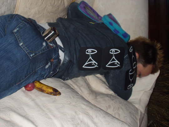 LoL at all of them! was talking to my mate about games you play when ur wrecked and he has sum mates who hang one of their testicles out of their flies and talk to unsuspecting people and the game is to see how long it takes for them to notice. I told him about the 'pile things on spud while hes asleep' game but cudnt find the pix think its class