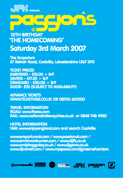 passion 12th birthday with armin van buuren sat 3rd march This is your homecoming too Welcome home. A tribute to Armin Van Buren by JFK Over the last 12 years, Passion has been fortunate enough to have been able to provide a platform for the worlds greatest DJ’s to showcase their talent. In that time we have seen may young artists grow and go onto conquer the dance world. We have never claimed to have ‘found’ these artists but we acted merely as a cog in the growth of their careers, but we know that they had a big part in helping create what Passion has become today. One such talent we were asked to expose during the late 90’s was a Dutch DJ called ‘Armin Van Buuren’. His loveable manner and silky crowd pleasing DJ skills went onto win him such adoration that we just had to offer him a monthly residency; he even used to dance on the podiums in the crowds after his sets! Soon after this his career moved into fast forward, his radio show was winning awards and his renowned record label and production work soon meant he was one of the worlds most in demand DJs and has recently been voted as the 2nd in DJ magazines prestigious top 100. Armin has never forgotten his roots and when I made the call asking whether he would return after a three year absence… he said: ‘Count me in… let’s call it THE HOMECOMING’ Welcome home Armin… we have missed you! YOUR Passion Passion has always been renowned as the ultimate peoples club. By the people for the people, because you are and always will be what makes this place so special. Now, for the first time, we are giving you the chance to be part of that special feeling, you can vote for the DJ’s that play in the YOUR Passion arena. There have been many people who have been inspired after a night out at Passion to take up the art of DJing, they now have the chance to play in the venue of their inspiration. Each event will feature new and exciting Passion inspired talent alongside some of the more established Passion favourites, the music will be a mixture of everything dance whether it be electro funky beats to tech influenced kicks… all will be Passionate about PASSION, all will be voted for by YOU! After all this is YOUR Passion To vote for the DJs that will play in the YOUR Passion room at the next event visit www.passionuk.com/yourpassion