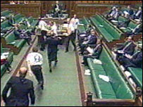 Parliament was suspended after five protesters burst into the Commons chamber while MPs debated whether to ban hunting with dogs.