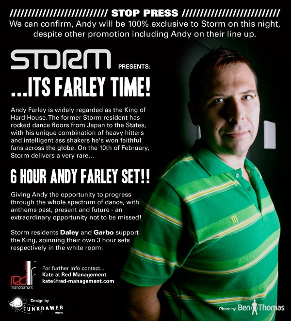 storm presents "FARLEY TIME" sat 10th feb @ the emporium STORM presents: Its Farley Time! Andy Farley is widely regarded as the King of Hard House. The former Storm resident has rocked dance floors from Japan to the States, with his unique combination of heavy hitters and intelligent ass shakers he's won faithful fans across the globe. On the 10th of February, Storm delivers a very rare… 6 HOUR ANDY FARLEY SET!! Giving Andy the opportunity to progress through the whole spectrum of dance, with anthems past, present and future - an extraordinary opportunity not to be missed! Storm residents Daley and Garbo support the King, spinning their own 3 hour sets respectively in the white room. **PLEASE NOTE THAT ANDY FARLEY IS PLAYING EXCLUSIVELY TO STORM AND NO OTHER PROMOTION ON THE 10TH FEB!!** Main Room Andy Farley (World Exclusive 6 Hour Solo Set) White Room Daley (3 Hour Set) Garbo (3 Hour Set) 10PM - 4AM £10 o.t.d The Emporium 67 Belvoir Road Coalville Leicestershire LE67 3PD 01530 815278 www.theemporiumuk.com www.dontstayin.com/parties/storm paying guestlist tex names to 07835626226