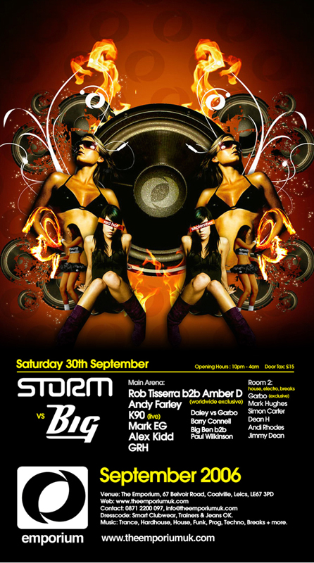 storm vs big @ the emporium sat 30th sept Storm vs Big!! 30th September 2006 Worldwide exclusives don't come around that often in the hard house scene, but when they do - they tend to be a little bit special. You'd be hard pressed to find a happening more exciting than the coming together of two of the most popular DJ's on the circuit - Bobby T and Amber D. For the first time ever on the 30th of September, these beaming hard house superstars will be going hell for leather, tearing up the dancefloor and lighting up faces around The Emporium with their infectious smiles and upfront CD wallets. Joining the fun will be former Storm resident, and 'godfather' of hard house - Andy Farley - with his inimitable grooves and heavy hitting artillery. We welocme back legendry Live Act K90 , who never fails to deliver. Storm vs BIG will see one of those very euphoric, hands in the air showcases that only he can do best. Storm was one of the first hard house clubs in the country to recognise the cross boundary talents of a certain Mr Mark EG. The man himself will be back once again, with the usual outlandish DJ box antics and punishing beats. Goodgreef golden boys Alex Kidd and Barry Connell will be joining crowd favourite GRH - along with Storm residents Daley and Garbo to make this a heavy hitting main room - packed to bursting point with ear-bleeding-audio. In the backroom - Garbo, spinning an exclusive electro set, will be joined by the likes of Dean H, Andi Rhodes and Jimmy Dean - providing a tasty looking blend of nasty beats and dirty house. Main Arena Rob Tissera vs Amber D (Worldwide Exclusive) Andy Farley K90 LIVE Mark E.G Alex Kidd GRH Daley vs Garbo Barry Connell Big Ben vs Paul Wilkinson Arena 2 Electro/House/Breaks Garbo Mark Huges Simon Carter Dean H (funk-deluxe) Andi Rhodes Jimmy Dean 10pm - 6am Door Tax - £15 The Emporium Coalville Leicestershire