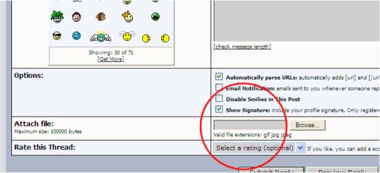 when u post, there's an 'Attach file' thingy at the bottom. Pictures have to be of a certain size though (540pixels by 540pixels i think) see below!