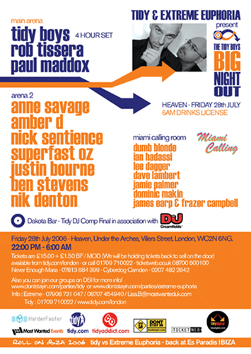 tidy boys big night out fri 28th july @ heaven THE LONG HOT SUMMER Having opened our Ibiza season with an almighty bang, the Extreme Euphoria and tidy crew are in one hell of a good mood! In fact, we’re in such buoyant spirits we’ve decided to let the cat out of the bag and tell you what we’re doing our next bout at Heaven in London. Friday July 28th is when our next soiree takes place, and we’ve no qualms about calling it a super event! There are two main features to this edition of Tidy & Extreme Euphoria and both are as big as each other. First up is the one of two focal points. It’s the brand new Tidy Boys Big Night Out! The dynamic duo have remixed their show stopping extravganza, just 10 months after it started, and we have to say it’s looking like the dogs bollocks! 4 hours of mayhem from the boys as they take to the stage and put on a performance of unrivalled proportions, complimented by the show’s resident side-kick the young and super talented PAUL MADDOX. Now, unlike other Big Night Out’s, this edition will feature an extra special guest in the main room. He’s been a leading force in hard house since its inception; it can only be ROB TISSERA. For those who fancy a little variation, take yourselves up one level to the Star Bar, where as well as 3 tidy & Extreme debuts, a smattering of national heroes have been cast to deliver another element to this ridiculously huge night! Feast your eyes on this….. ANNE SAVAGE, AMBER D, NICK SENTIENCE, SUPERFAST OZ (DEBUT), JUSTIN BOURNE (DEBUT), BEN STEVENS and NIK DENTON (DEBUT). Room 3 is left to the capable hands of Miami Calling, delivering house electro and breaks, and with on top of that; an special treat! Donning her alter-ego as DUMB BLONDE is Anne Savage, and for those who’ve never heard her alternative set – make sure you’re down the front! Hosts LEE DAGGAR and IAN HADASSI are joined by DAVE LAMBERT, JAMIE PALKER, DOMINIC MAKIN, JAMES EARP and FRAZER CAMPBELL. Now then, to the all important room that will see the emergence of a star in the making….. Over the past 3 months, tidy in association with DJ Magazine have been on the look out for tidy’s new superstar. We’ll have run 3 heats in varying cities around the UK, and have narrowed it down to just 4 finalists. Room 4 is where the final will take place, and we urge you to turn up in force and show your support. There can only be one winner, and by 2am, we’ll know who has won a year’s tidy management contract and set at this year’s Creamfields. This is undoubtedly our biggest London show to date and is guaranteed to pack out! We’ve not upped the ticket price since we started, which remains at £15 plus booking fee. TIDY AND EXTREME EUPHORIA EXTREMELY TIDY CLUBBING TICKETS www.tidy.com/london www.ticketweb.co.uk