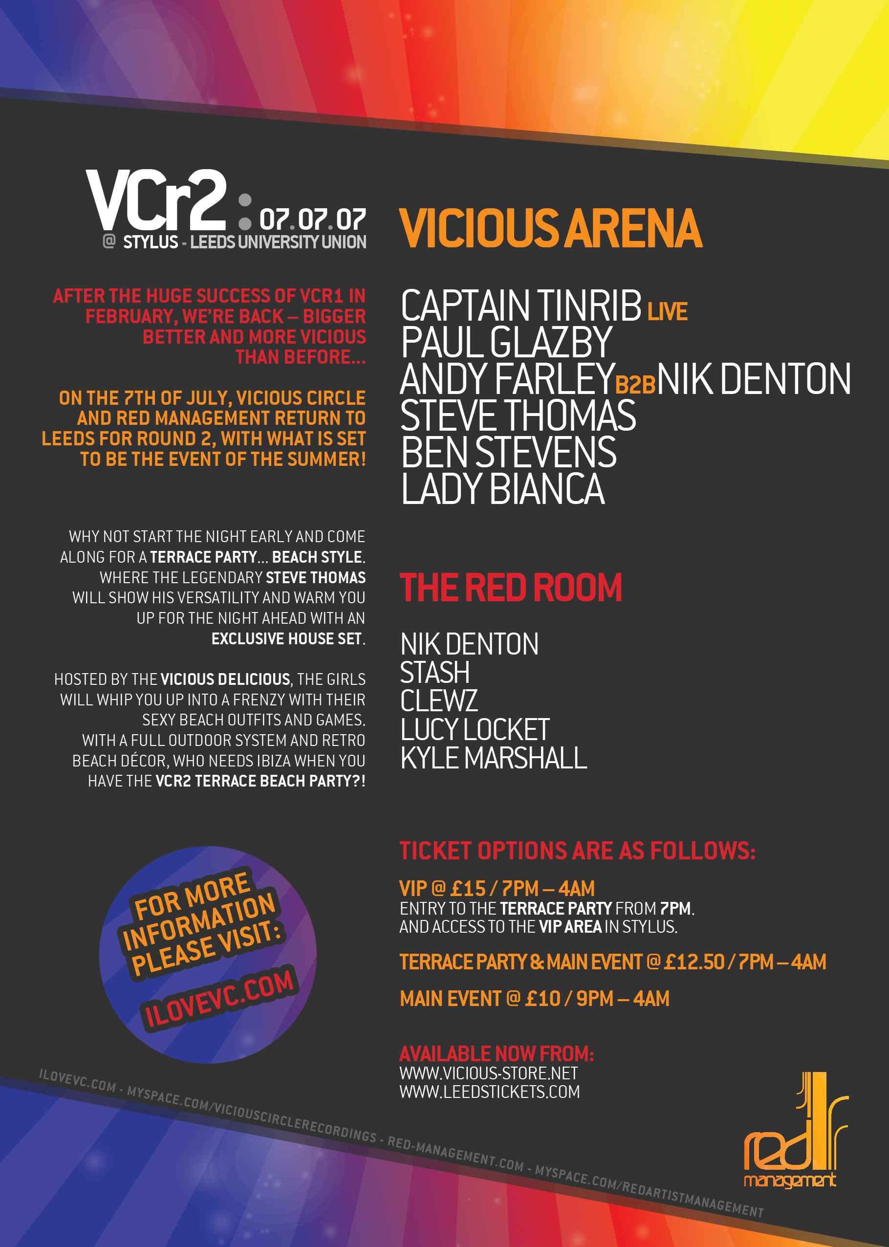 VCr2 @ Stylus, Saturday 7th July 2007 We kicked things off on Leeds Canal on Saturday 5th May. One boat, a hundred dedicated clubbers, a beautiful May sunset and 5 of the world’s best hard dance DJs who rocked it out and started VCr2 as it means to go on. But after the huge success of the VCr2 warm up, we’re now onto the main event… VCr2 @ Stylus, Saturday 7th July 2007 After the many venues VC has visited, Stylus is the one that suits the brand more than any other. VCr1 couldn’t have worked any better, but VC HQ is always up to the challenge. Which is why we have a very special pre-party planned for a few lucky guests as well this cracking line up… The second outing of Vicious Circle in Leeds will see legend Captain Tinrib make his VCr debut. Since he fled to New Zealand last year, trips back to the UK are few and far between. But we have snapped The Captain up on a rare visit back. The last time he joined a VC line up was at I Love VC at The Fridge in 2005, where in true Tinrib form, he thrashed out one of his legendary live performances to over 1000 adoring fans. Over a year on, and he’s back. With what will no doubt be a performance filled with enough energy to blow the roof of Stylus right off! Our next very special guest is none other than Trade legend Steve Thomas. A close friend of Vicious Circle for many years, Steve is no stranger to VC line ups. Like The Captain, I Love VC in London was the last time he played for a VC crowd. But Steve is ready to take on the northern crowd of VCr at Stylus. And because we’re greedy, we have another special guest, who goes by the name of Lady Bianca. One of the few female DJs to come on board with VC, Lady Bianca has recently received resident status at Trade. It has been a long time coming but we have finally synchronised our diaries and are counting down the days until the beautiful and 100% genuine Lady blesses the decks of Stylus. VCr2 will also see a Back2Back debut. Andy Farley & Nik Denton come head to head for a 2 hour onslaught as part of the Toolbox V tour. Another special announcement about this set will follow… And need we say it, Mr Vicious himself, Paul Glazby will be there to make VCr2 what it is. Without him, there wouldn’t be a party in the first place. We give thanks to Glazby for having the balls to set up the best Hard House label in the UK and beyond. And last but by no means least… a VC party wouldn’t be a VC party without Ben Stevens. In the words of production genius Paul Maddox after the VCr2 boat party, ‘I forgot how much of a fucking wicked talent Ben is’. Need we say any more… VICIOUS ARENA Captain Tinrib LIVE Paul Glazby Andy Farley B2B Nik Denton Steve Thomas Ben Stevens Lady Bianca If you’re wondering what we have planned this time around in Room 2, we will be showcasing some of the finest House talent Leeds has to offer. As well as the usual pumping sets from the House Of Red residents Stash & Clewz. Keep your eyes peeled for an announcement of the full Red Room line up coming soon… And for those who just can’t get enough of the VCr experience, here comes the treat. You can start the party early and come along for a Terrace Party... BEACH STYLE. Hosted by the Vicious Delicious, these girls will whip you up into a frenzy with their sexy beach outfits and games. With a full outdoor system and retro beach décor, who needs Ibiza when you have the VCr2 Terrace Beach Party?! So all that’s left now is for you to decide how you’d like to join us celebrate what is ever proving to be the greatest Hard House label in history. Ticket options are as follows… VIP @ £15 / 7pm – 4am Entry to the Terrace party from 7pm. And as we did with VCr1, you will have your very own area in Stylus to look down on the DJs thrash out their very best tunes. With your own bar and seating area, you can enjoy your VCr2 experience in true VIP style. Terrace Party & Main Event @ £12.50 / 7pm – 4am Entry to the Terrace Party above and the main event starting at 9pm. Main event @ £10 / 9pm – 4am Entry to Stylus and The Red Room. Whatever ticket you buy, VCr2 will be the event of the summer. Do not miss out!! Available NOW from vicious-store.net and leedstickets.com