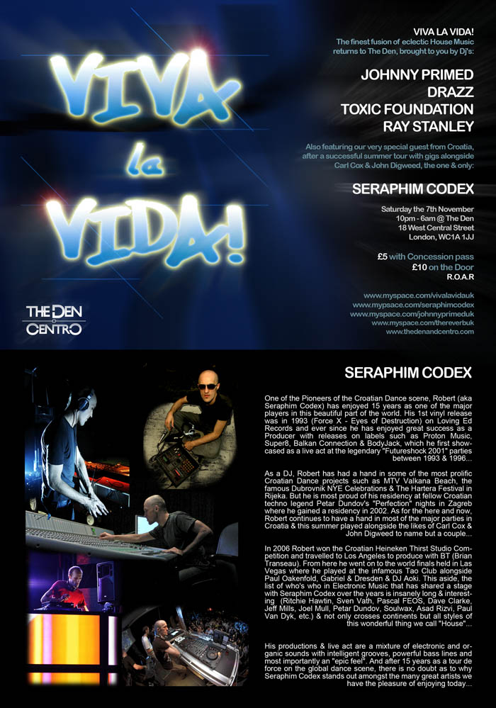 VIVA LA VIDA! Sat 7th November @ THE DEN... Dear Friends, Hot off the back of our 1st successful party at our new home THE DEN in October, VIVA LA VIDA sees the 2nd instalment on Saturday the 7th of November. Thrilling you on the night you with their delectable deck skills are resident Dj's JOHNNY PRIMED & DRAZZ and the legendary RAY STANLEY. Accompanying them are winner of the Felix Da House Cat "We All Wanna Prince" remix competition TOXIC FOUNDATION & also after his successful summer tour with gigs alongside the likes of Carl Cox and John Digweed, the one & only SERAPHIM CODEX. Kick off is @ 10pm, so be there early to ensure entry to another rockin' night at VLV. See Y'all there, Much Love, J.P. & DRAZZ xx. P.S. - Upon entry don't forget to quote VIVA LA VIDA!